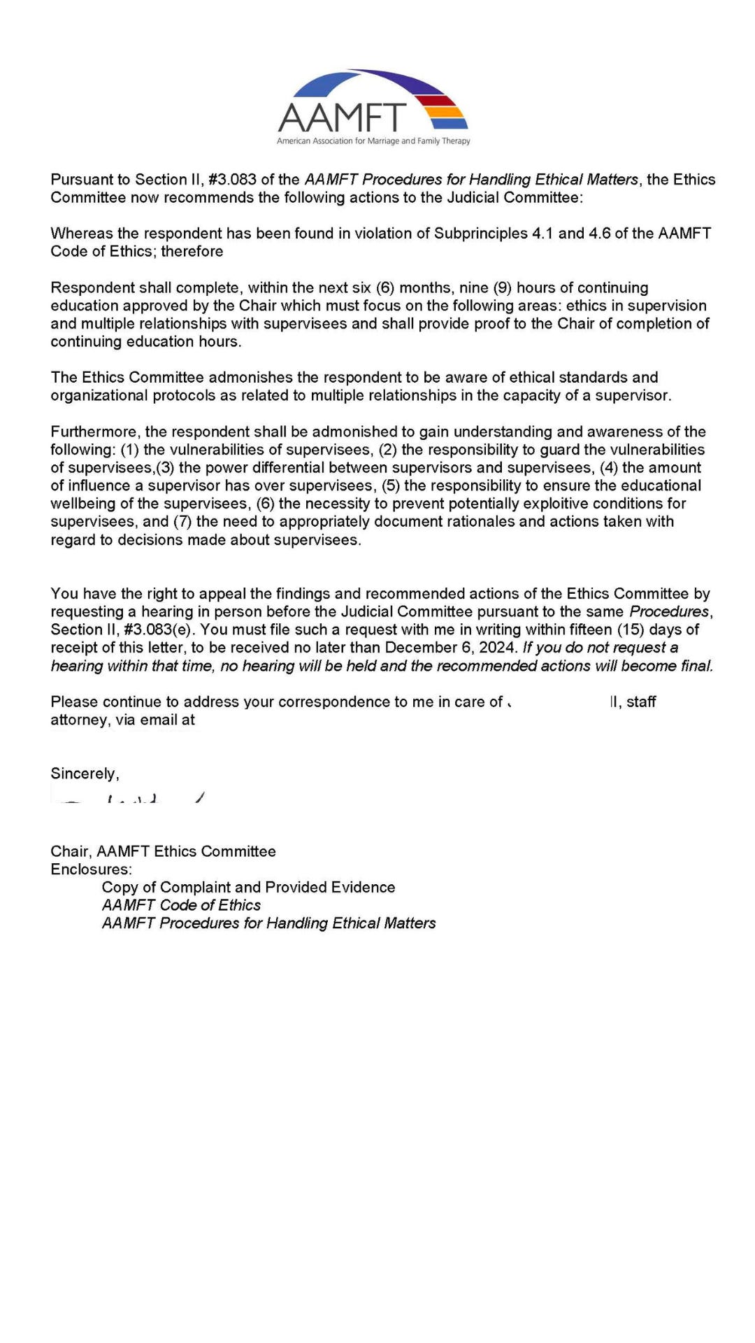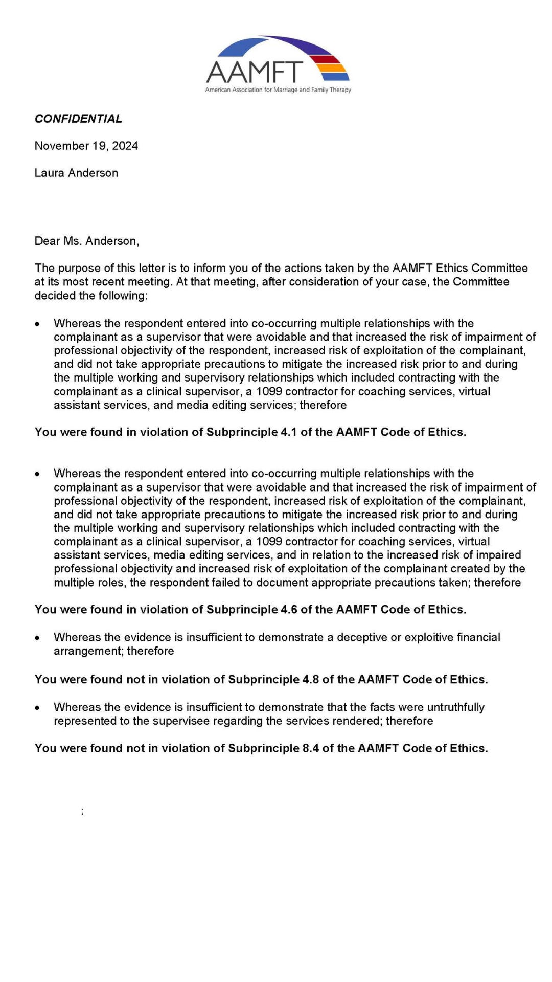 The article referenced a finding by the AAMFT Board of Ethics that I engaged in a dual relationship with a former academic intern who also worked as a coach and administrative contractor for my company; this person was never a client of mine. The finding of the dual relationship was true, and I accepted it. I completed the required 9 hours of continuing education in spring 2025, and I remain in good standing with the AAMFT. I have no present or past censures or sanctions on my license or credentials.